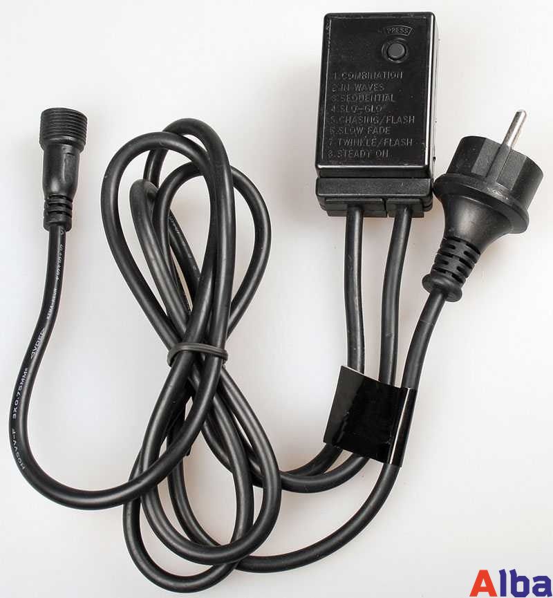 Блок питания длиной 1,5 м, с контроллером. Имеет 8 различных режимов, и функцию памяти последнего выбранного. Подходит для изделий 2 pin. Можно подключить до 10 гирлянд.