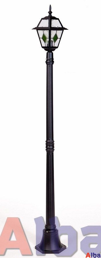 Садово-парковый светильник серии Faro IgG Мощность: 100Wt Цоколь: E 27 Высота 185 см Степень защиты: IP 44 Плафон: стекло c зеленым ромбом Корпус: металл Цвет: черный (black)