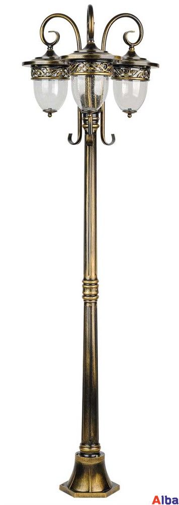 Садово-парковый светильник серии Krakow Место установки: на горизонтальную поверхность (на землю) Тип монтажа: интегрированный (монтаж на бетонную, деревянную, каменную поверхность) Наличие анкерной закладной: есть Мощность: 3*100 Wt Цоколь: E 27 Степень защиты: IP 44 Класс защиты: Class I Плафон: фактурное стекло Корпус: металл Цвет: черный с золотом, глянцевый (black/gold) Светильники серии Krakov хорошо подходят для освещения входных групп, освещения веранд и балконов. Могут использоваться внутри помещений.