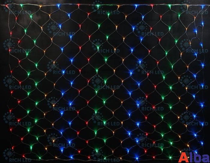 Размеры гирлянды-сетки для улицы составляют 2х1,5 или 2х3 метра, а внешний вид напоминает рыболовную сеть. Пересекающиеся вертикальные и горизонтальные нити образуют ромбы, внутри которых находятся яркие огоньки. Все светодиоды закреплены с помощью эпоксидного клея, что обеспечивает защиту от влаги и пыли. Провод может быть выполнен в белом, черном или прозрачном варианте. Изоляция имеет высокую прочность и устойчива к механическим повреждениям и влаге.