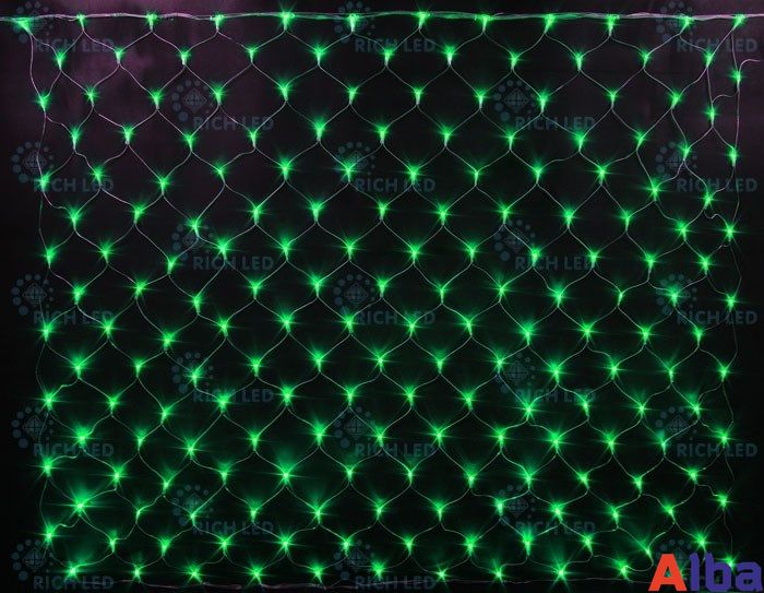 Размеры гирлянды-сетки для улицы составляют 2х1,5 или 2х3 метра, а внешний вид напоминает рыболовную сеть. Пересекающиеся вертикальные и горизонтальные нити образуют ромбы, внутри которых находятся яркие огоньки. Все светодиоды закреплены с помощью эпоксидного клея, что обеспечивает защиту от влаги и пыли. Провод может быть выполнен в белом, черном или прозрачном варианте. Изоляция имеет высокую прочность и устойчива к механическим повреждениям и влаге.