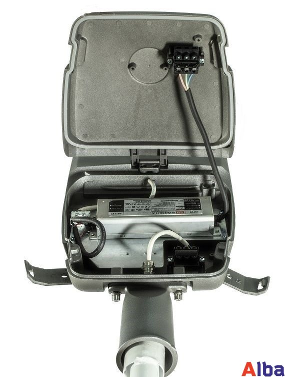 Важно отметить, что светильник может регулироваться по углу наклона. Светильник устанавливается на трубу до 60 мм. В случае выхода из строя драйвера светильника его легко можно поменять, не снимая сам светильник с опоры. Для это предусмотрен специальный блок с автоматическим размыкателем цепи при открытии отсека с драйвером.