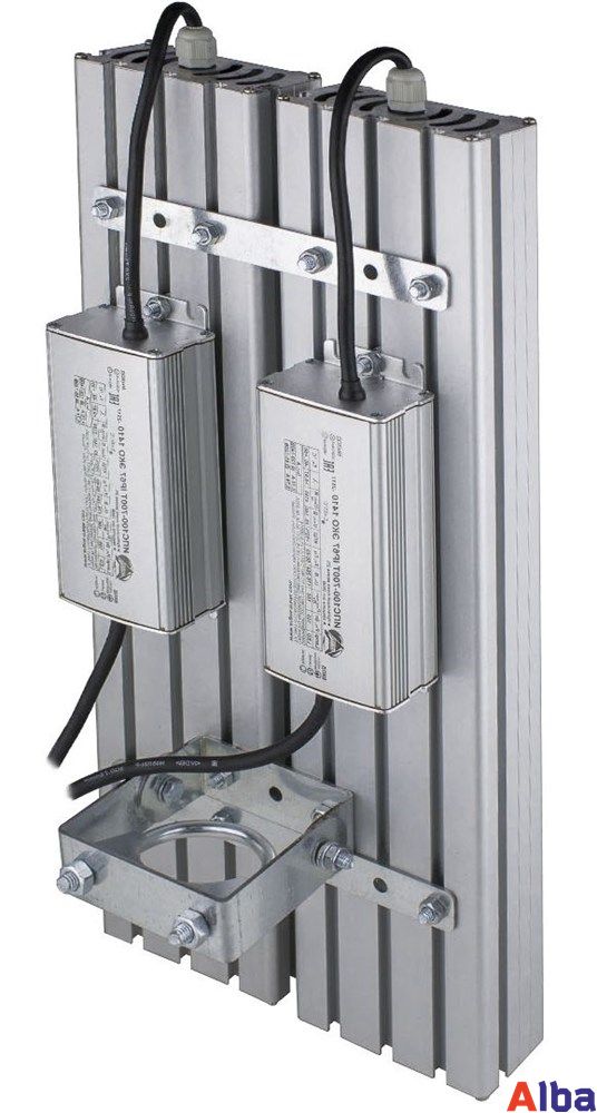 - С помощью скобы осуществляется консольный монтаж на трубы до 50 мм. и регулируется угол наклона светильника в горизонтальной или вертикальной плоскости